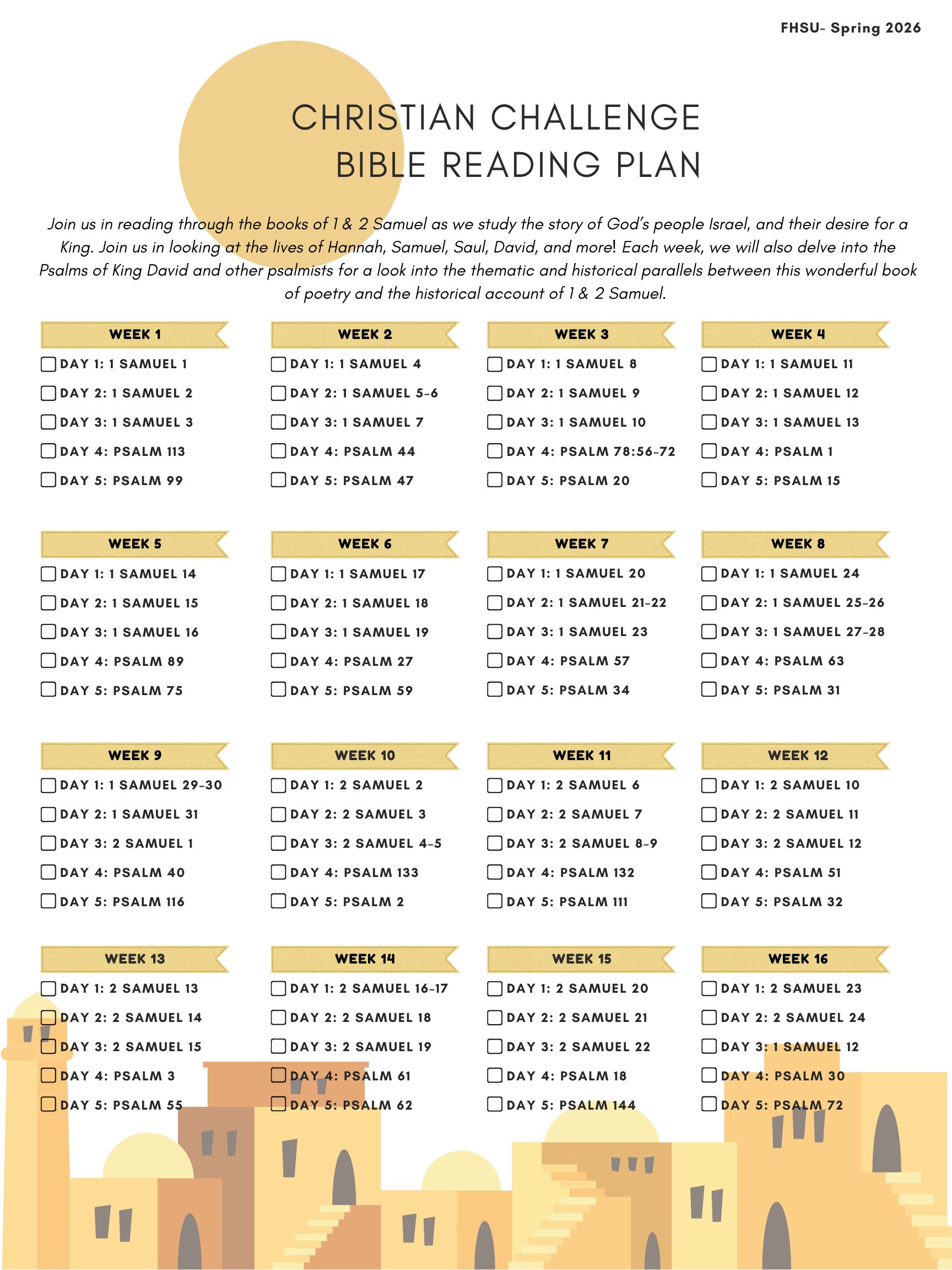 Join us in reading through the books of 1 & 2 Samuel as we study the story of God’s people, Israel, and their desire for a King. Join us in looking at the lives of Hannah, Samuel, Saul, David, and more! Each week, we will also delve into the Psalms of King David and other psalmists for a look into the thematic and historical parallels between this wonderful book of poetry and the historical account of 1 & 2 Samuel.